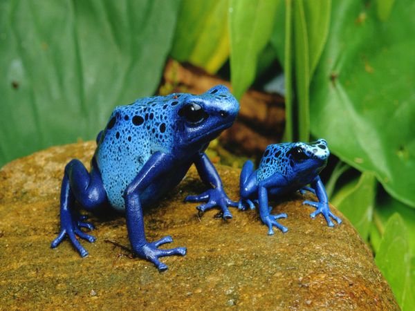 Poison dart frog (also dart-poison frog, poison frog or formerly poison arrow frog) is the common name of a group of frogs in the family Dendrobatidae which are native to Central and South America. Unlike most frogs, these species are active during the day and often have brightly-colored bodies. Although all wild dendrobatids are at least somewhat toxic, levels of toxicity vary considerably from one species to the next and from one population to another. Many species are critically endangered. These amphibians are often called "dart frogs" due to the Amerindians' indigenous use of their toxic secretions to poison the tips of blowdarts. However, of over 175 species, only three have been documented as being used for this purpose (curare plants are more commonly used), and none come from the Dendrobates genus, which is characterized by the brilliant color and complex patterns of its members.